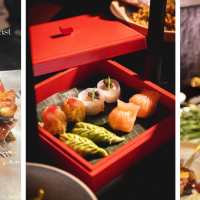 Lobster tempura, avocado. Top: Crawfish salad, flying fish roe