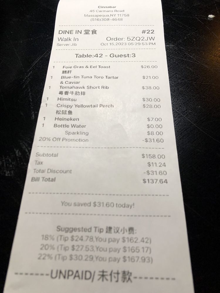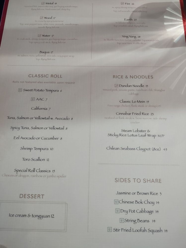 Introducing the menu at Cinnabar, a trendy and intimate sushi bar offering Chinese and seafood dishes in Massapequa, NY. With a diverse range of soups, salads, hot and cold starters, customers rave about the quality and creativity of the dishes. Highlights include the Classic Kani Salad with apple slivers, the Crispy Calamari with salt & pepper, and the BlueFin Tuna Toro Tartar & Caviar Rice served with seaweed chips. The lychee martinis and signature cocktails are also a hit, adding to the overall dining experience. With accommodating service and a visually appealing ambiance, Cinnabar promises a delightful dining experience for all.